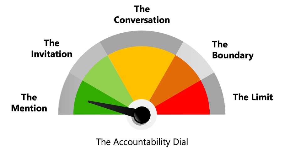By moving through the Accountability Dial, we match the intensity of our feedback to the situation. This approach allows us to address minor issues with empathy and curiosity, saving serious actions for when they are truly necessary and ensuring that dialogue has been thoroughly exhausted.