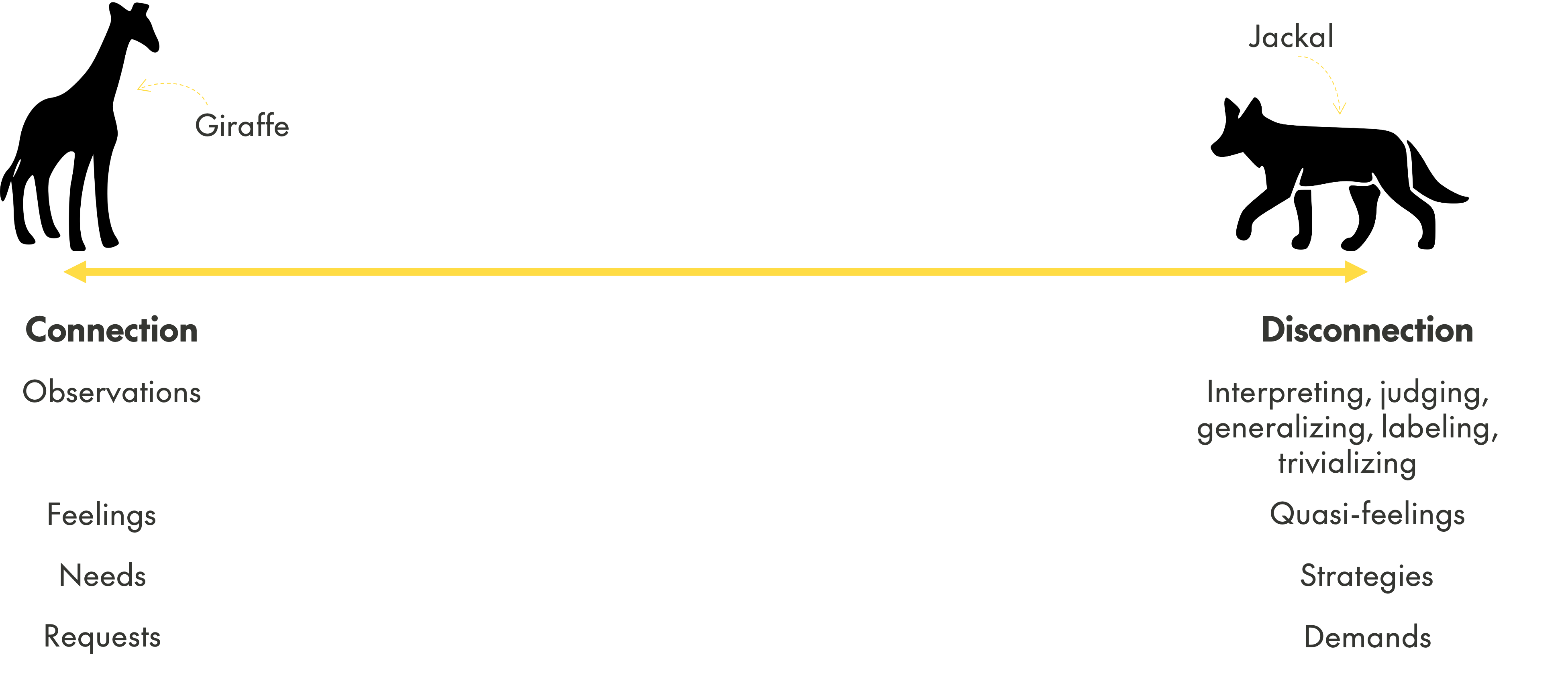 The jackal makes us aware that we are in pain because of an unmet need. The longer that need goes unmet, or the more important that need becomes to you (possibly even subconsciously), the more tempting it will become to communicate as a jackal. And that would be a pity, because it can damage a relationship or cause you and another person to disconnect. Practicing giraffe communication allows you to be both direct and unambiguous while staying connected and contributing to each other’s quality of life.